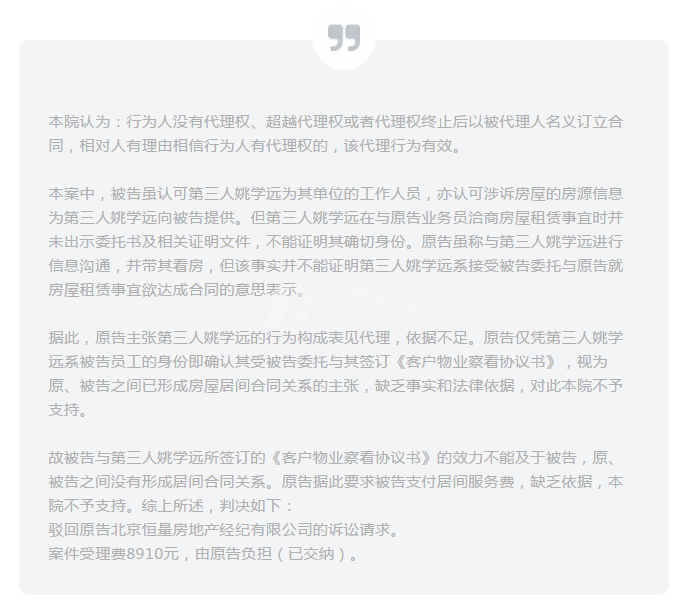 据此,原告主张第三人姚学远的行为构成表见代理,依据不足。原告仅凭第三人姚学远系被告员工的身份即确认其受被告委托与其签订《客户物业察看协议书》,视为原、被告之间已形成房屋居间合同关系的主张,缺乏事实和法律依据,对此本院不予支持。