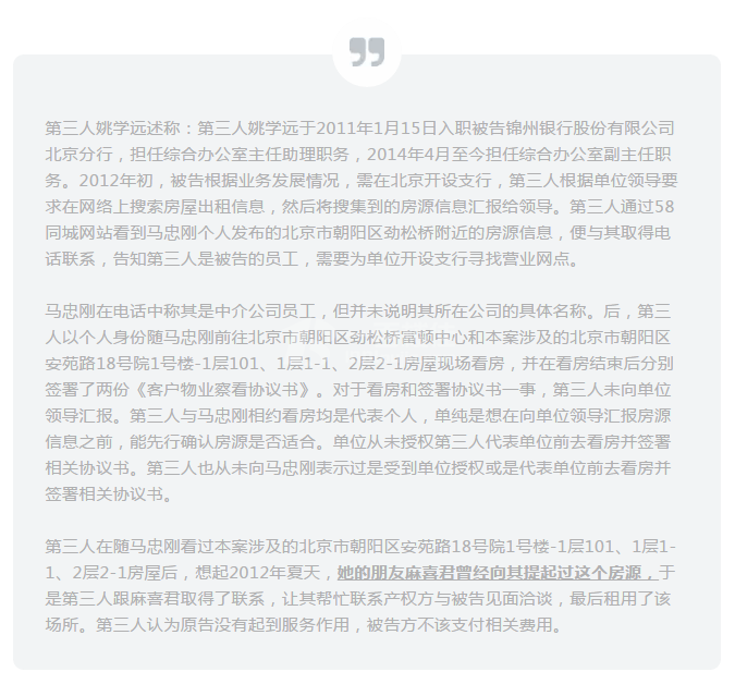 第三人姚学远述称:第三人姚学远于2011年1月15日入职被告锦州银行股份有限公司北京分行,担任综合办公室主任助理职务,2014年4月至今担任综合办公室副主任职务。2012年初,被告根据业务发展情况,需在北京开设支行,第三人根据单位领导要求在网络上搜索房屋出租信息,然后将搜集到的房源信息汇报给领导。第三人通过58同城网站看到马忠刚个人发布的北京市朝阳区劲松桥附近的房源信息,便与其取得电话联系,告知第三人是被告的员工,需要为单位开设支行寻找营业网点。