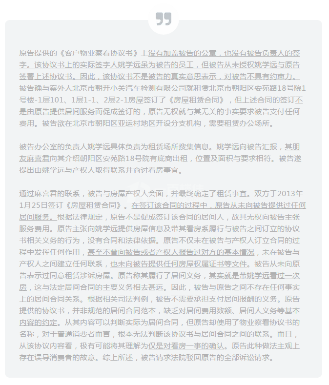 原告提供的《客户物业察看协议书》上没有加盖被告的公章,也没有被告负责人的签字。该协议书上的实际签字人姚学远虽为被告的员工,但被告从未授权姚学远与原告签署上述协议书。因此,该协议书不是被告的真实意思表示,对被告不具有约束力。被告确与案外人北京市朝开小关汽车检测有限公司就租赁北京市朝阳区安苑路18号院1号楼-1层101、1层1-1、2层2-1房屋签订了《房屋租赁合同》,但上述合同的签订不是由原告提供居间服务而促成签订的,原告无权就与其无关的事实要求被告支付任何费用。被告欲在北京市朝阳区亚运村地区开设分支机构,需要租赁办公场所。