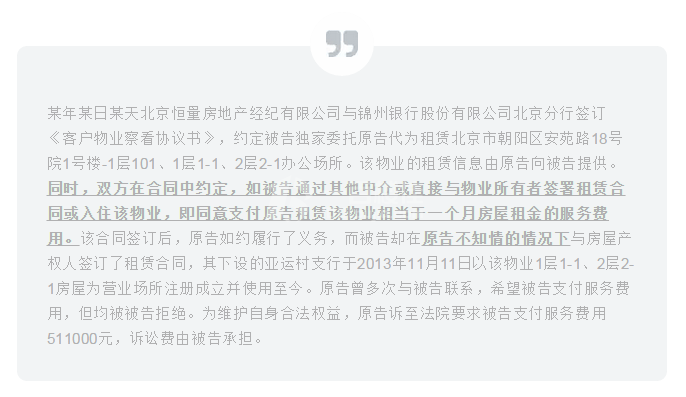 这个案例的流程大概是这样的:北京恒量房地产经纪有限公司通过某渠道获得锦州银行股份有限公司北京分行这个客户,在约定帮助其找营业厅店铺及办公场所之前,双方签订了一份《客户物业察看协议书》。