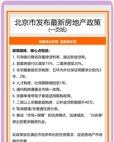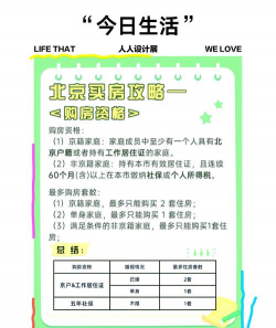 1、限购政策:对于已经在北京拥有一套住房的本市户籍居民家庭、持有北京市有效暂住证在北京没有住房但连续5年或5年以上在北京缴纳社保或个人所得税的非北京市户籍居民家庭,限购买一套住房。该套住房或为新房或为二手房。