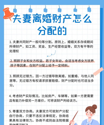 4,抚养权方面,要按照那一方的抚养对孩子成长有利原则,法院确定抚养权时会综合考虑孩子现在的生活状态、夫妻双方的工作收入及道德方面及孩子是否一直由一方父母在抚养等因素来判断。2岁以下的小孩一般判给母亲抚养,10以上的孩子,要听取孩子的意见.若有两个小孩,原则上是一人抚养一个小孩的。