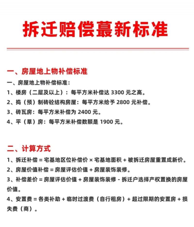1、周转补偿费,用于补偿被拆迁房屋住户临时居住房或自找临时住处的不便,以临时居住条件划档,按被拆迁房屋住户的人口每月予以补贴。房屋补偿费(房屋重置费),用于补偿被拆迁房屋所有权人的损失,以被拆迁房屋的结构和折旧程度划档,按平方米单价计算。