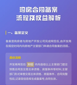 商品房买卖合同备案是房屋交易过程中的重要环节,购房合同备案是指买卖双方签订购房合同后30天内,开发商要向房管局申请办理商品房买卖合同备案或商品房预售合同备案手续。房产合同备案流程是先网签后备案,经相关部门审核后取得备案号即可。房管局审核期限为10日,根据业务量的多少,一般在3-5日即可领取备案合同。