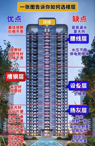 7.居住者实际情况。都说买房没有好的,只有合适的。虽然从噪音、采光、通风上看,一层或者底层都不是好的选择。但是考虑到老人的腿脚不太方便,以及孩子的安全等因素,选择1、2、3层也是不错的。