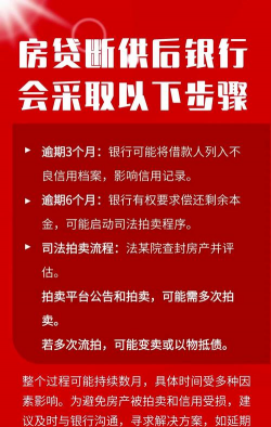 大多数银行规定,房贷断供超过6个月,房子就会进入司法拍卖流程。银行起诉逾期用户后,诉讼期间房产会被冻结,最终会被拍卖。要避免房贷断供,可以向银行申请延期还款。