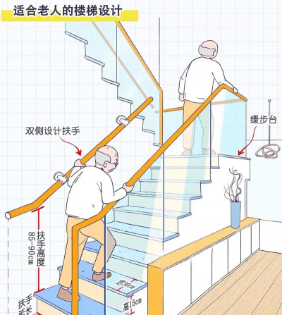 扶手的设计同样不可忽视。扶手的直径一般应设计为5cm左右,这样可以与手的虎口张开的宽度相匹配,使用时会更加舒适。此外,栏杆的间距也要小于11cm,以确保行走安全,特别是对于有小孩的家庭,护栏板的高度应保持在95cm左右,以防止孩子攀爬翻越。