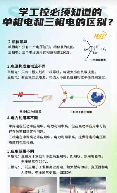 在三相电中,三根火线的电流相位依次相差120度,这种相位差使得电能的输送更加平稳,能够有效地平衡负载,避免电流波动带来的不稳定性。因此,三相电在工业领域尤为重要,尤其是在需要大功率设备的场合,如发电厂、工厂的电动机等。
