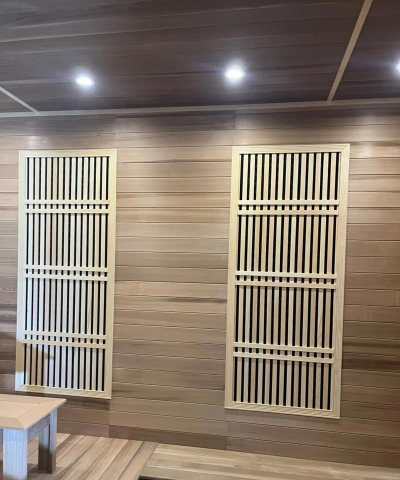 安装音响接线、氧吧、门把手、书报架、杯托等配件后,家用汗蒸房基本完成。