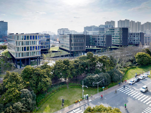 华鑫天地田林路200号,项目由若干建筑体块组成,造型各不相同,顺应场地以及与城市的联系,建筑平面转折、朝向、视野,高度以及光线变化丰富,既有灵活的功能,又呈现出独特的性格。建筑师可持续发展理念融入设计中,充分重视良好的自然采光、日照,无视线干扰,通风,具有节能方面的优势。同时,注重自然地元素,建筑放置于绿色的花园之上,绿化屋面和河岸的景观自然衔接,建筑立面外墙为交替的不透明和通透玻璃条形落地窗构成,竖向的框条带来统一的韵律。立面的细节处理,将建筑美学、建筑功能、节能等因素有机的结合起来,凸显园区的特色。